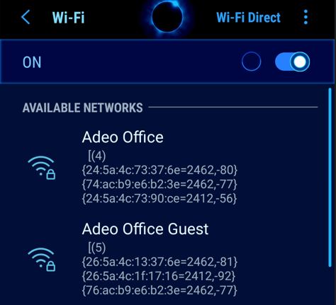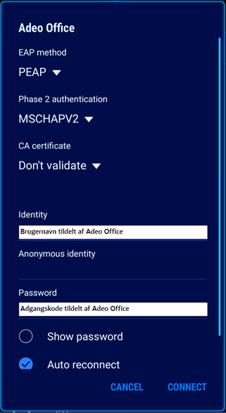 Åben WiFi indstillinger på mobil og log på ”Adeo Office”.