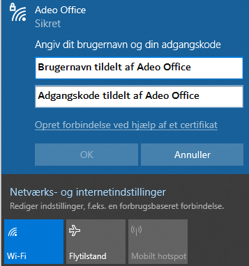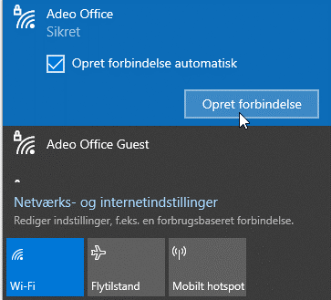 Åben for WiFi og tryk på netværket ”Adeo Office”, og tryk ”Opret forbindelse”.